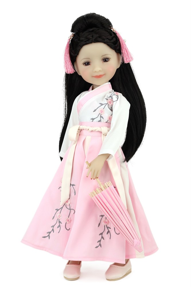 Национальная китайская одежда куклы, выполненная в нежно-розовой, бело-сливочной палитре, украшена скромной, но очень изысканной вышивкой. Строгую прическу оживляет национальное китайское украшение. Легкость образу придаёт простой милый зонтик.